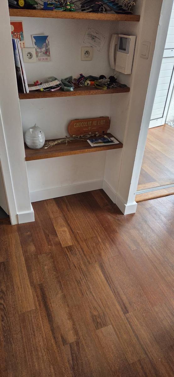 Contrairement à la vitrification de parquet qui crée une couche protectrice en surface, l’huile pénètre le bois et respecte son aspect naturel. Nous utilisons des huiles adaptées aux bois exotiques pour garantir un rendu chaleureux et une excellente résistance à l’usure. Cette technique est idéale pour les intérieurs où l’on souhaite une ambiance authentique et facile à entretenir.