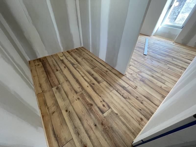Pose d'un parquet massif cloué sur lambourdes en sapin huilé décoratif à Blaye
