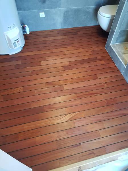 Nous avons également posé un magnifique parquet massif exotique en pont de bateau dans toutes les salles de bain.